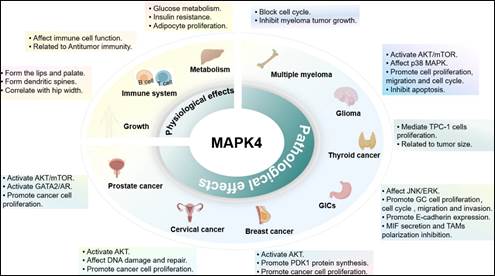 丝氨酸/苏氨酸蛋白激酶(MAPKs)作为细胞信号转导的关键调控因子,在细胞生命活动的多个环节中扮演着重要的角色。其中,MAPK4作为MAPK家族中的非典型成员,近年来逐渐受到了学术界的广泛关注。通过全基因组关联研究(GWAS),发现MAPK4与多种miRNA的潜在靶标有着密切关联。更为重要的是,研究表明,MAPK4在肿瘤细胞的生长、迁移、侵袭和耐药性等多个方面均展现出显著的抑制作用。这表明MAPK4在癌症治疗领域具有巨大的临床价值和应用前景。团队在前期工作(Cell Biosci,2020年;Hepatology,2021年;Can Innovation,2024年等)基础上,对MAPK4在乳腺癌、甲状腺癌、胶质瘤、前列腺癌和宫颈癌等常见肿瘤中的研究进展进行了全面而深入的梳理与归纳。此外,为了更深入研究MAPK4的抗癌机制,并为今后在癌症治疗中的应用提供更为精准的指导,团队创新性地提出了整合基因组学、蛋白质组学、代谢组学和生物信息技术等多学科技术针对当前存在的问题开展宏生物学研究的思路,以期系统阐述MAPK4的抗肿瘤效应机制,这一研究思路不仅丰富了我们对MAPK4功能的认识,也为开发基于MAPK4的临床肿瘤治疗新策略指明了方向。