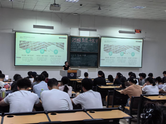2025 级研究生新生入学教育暨班团干部选举大会在第三教学楼第二十八阶梯教室顺利召开。学院副院长刘晖、科技与研究生科科长于红松、研究生辅导员陈久霞出席会议,2025 级全体研究生新生参会。大会由陈久霞主持。