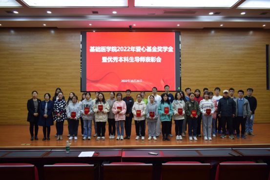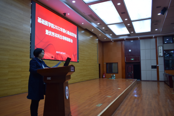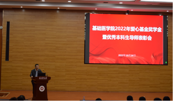 爱心基金奖学金实施细则,并就本次奖学金的评选做了说明;龙艺书记宣读了2022年爱心基金奖学金表彰决定及获奖学生名单,学院领导、老师共同为获奖同学颁奖并合影留念;获奖学生代表基础医学专业2020级车晴娅同学以“我的经历,为你助力”分享自己的学习心得,激励同学们努力学习,将个人理想追求融入时代发展大局。